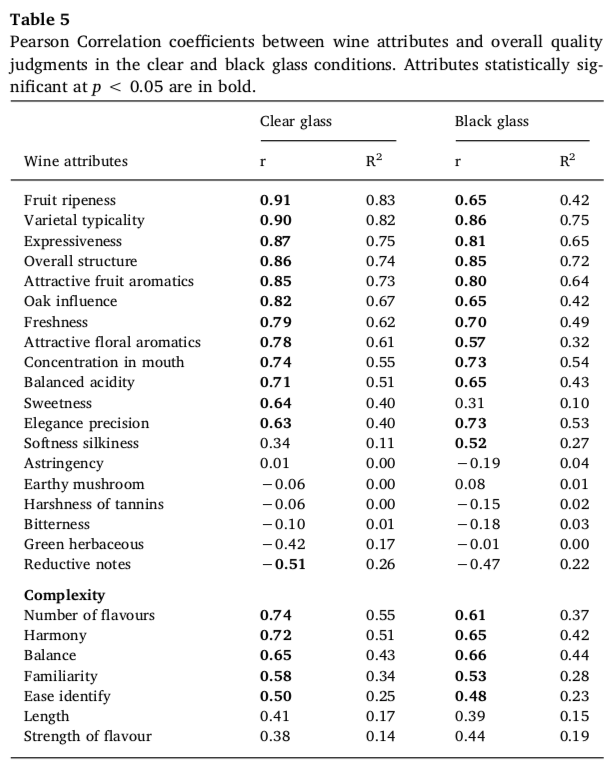 鉴于本研究的主要目的,我们将每种葡萄酒的平均总体质量得分分别与透明玻璃杯和黑色玻璃杯条件下的其他葡萄酒属性的平均得分进行了相关性分析,以突出影响总体感知质量的葡萄酒属性(表5)。在这两种条件下,正相关性最高的是品种典型性、表现力、整体结构和诱人的果香,而负相关性最高的是还原性。不同条件下的一些差异也值得注意:与黑玻璃杯条件相比,在透明玻璃杯条件下,水果成熟度、橡木影响、诱人的花香和甜味的正相关性更高,而绿色草本植物与总体感知质量的负相关性更高。
