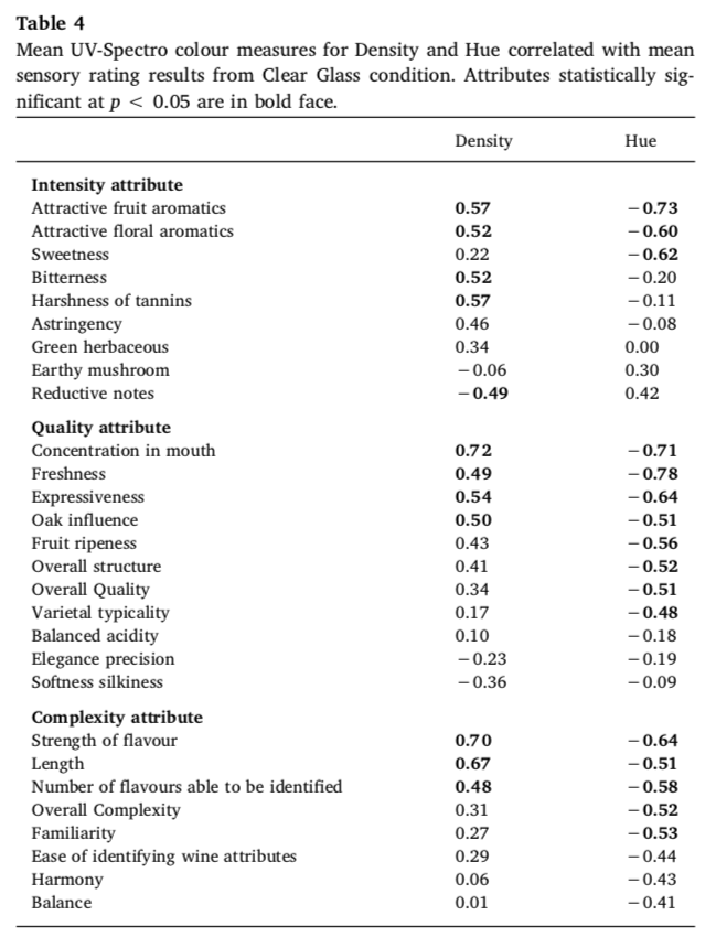 根据葡萄酒的颜色是否可见,对葡萄酒的一些属性进行了不同的评分。表4列出了每种葡萄酒的平均颜色测量值与透明玻璃杯条件下的平均描述性评分(浓度和质量属性)之间的相关性。颜色测量值(密度和色调)呈负相关,因此一般来说,与其中一个相关的测量值也与另一个相关。大多数属性(28项中的19项)都与颜色有明显的相关性。