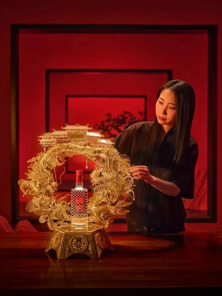 国窖1573以明代国宝窖池和非遗酿制技艺构筑“活态双国宝”概念,并牵手国宝技艺花丝镶嵌,打造主题宫灯作品激活非遗新体验。