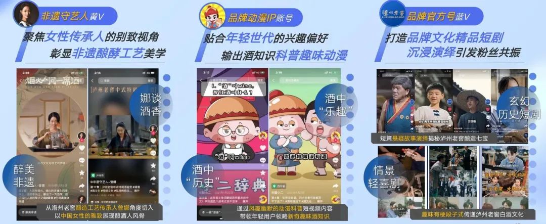 以泸州老窖为例,深耕国民短视频平台抖音,针对不同用户群体孵化运营新媒体账号矩阵,以差异化内容定位精准撬动圈层关注,实现与用户深度链接。