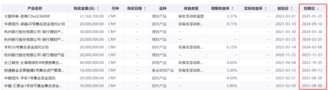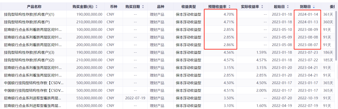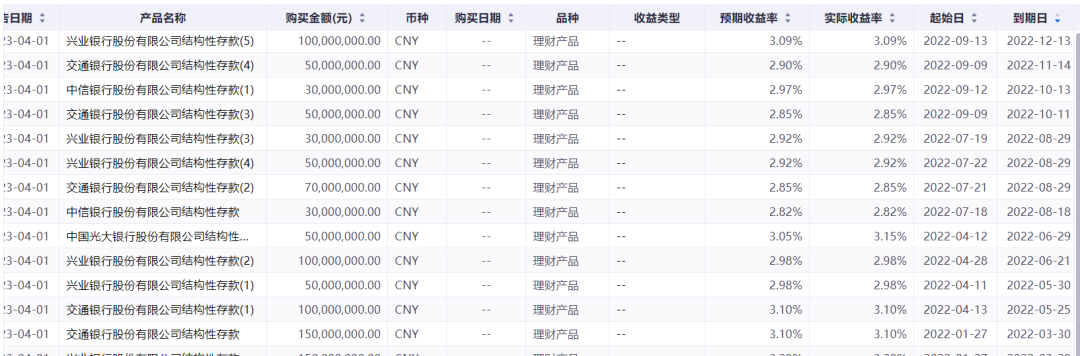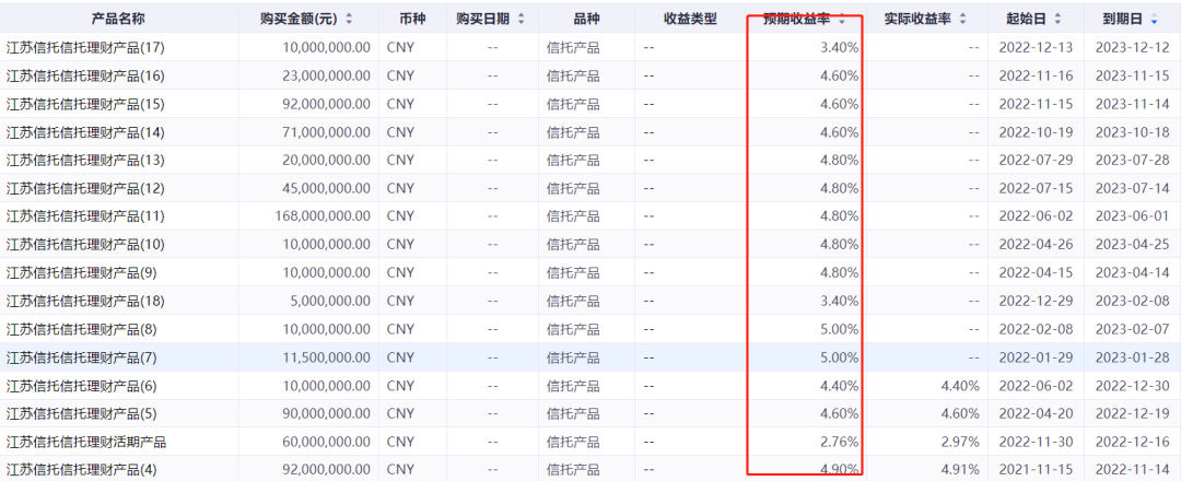 此外,本次暴雷的信托产品会引发“中国雷曼时刻”,导致严重债务危机吗?通常来说,一家企业的利润应该主要来自主营业务。但有些企业的净利润却是来自主营业务以外的收入。比如:处置不动产、理财收入、投资收入、政府补贴、税收减免、债务重组、资产置换等等。如果扣非净利润与净利润的差距很大,那么就要留个心眼了。上面提到的南都物业 ,其2022年净利润和扣非净利润就有3476万的差距,占比 达到24%。这就可能有问题。那么我们就应该仔细看一看它的财报了。看看它的非经常性损益是不是因为买了很多理财产品。2022年年报显示,南都物业一共购买了超过10亿的理财产品,未到期余额超过5.5亿,其中未到期信托有6000万!见下表 。已经到期且兑付的理财产品就没必要关注了。着重看还没有到期兑付的。一般来说,年化收益率低于5%的产品,通常不会有暴雷风险。有暴雷风险的,大都是因为投资了垃圾债(地产和城投债),这些债券的收益率可以给到8%-12%!从下表可以看到,南都物业的胆子是比较大的,不少理财产品的收益率都高于5%,甚至达到了8.71%。这些信托或者私募的预期收益率都可以在相关的网站和销售渠道查到,也可以通过万得、choice等数据库查到。