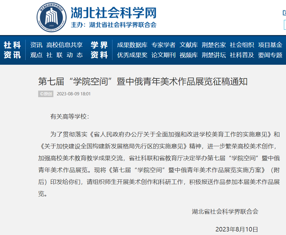今年是我国全面贯彻落实中共二十大精神的开局之年,我省将加快构建新发展格局,着力推动高质量发展,全面推进中国式现代化。同时,为了贯彻落实习近平总书记访俄成果及关于教育与文艺工作重要论述,以社会主义核心价值观为引领,紧扣时代脉搏、坚持人民立场、坚持守正创新,充分调动高校美术专业师生的积极性,繁荣高校美术创作,展示高校美术与设计创作,展示美术和设计教育教学成果,发现和培养青年美术人才,推动高校美术和设计教育教学改革与发展,促进中俄青年艺术家交流和两国友谊,在湖北省社科联、湖北省教育厅的指导下,由我院主办、武汉科技大学承办的主题为《第七届“学院空间”暨中俄青年美术作品展览》,从即日起开始征集作品,希望全国各高校的教师和大学生们,积极参与此次展览!
