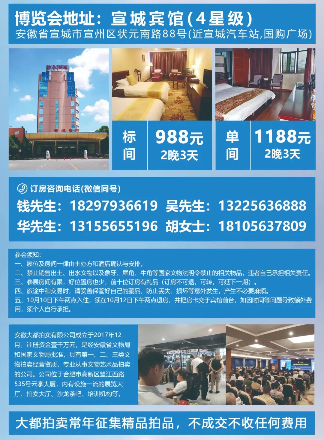 五、10月10日下午两点入住,须在10月12日下午两点退房,并把房卡交于宾馆前台,如因时间等问题导致额外费用,须个人自行承担。