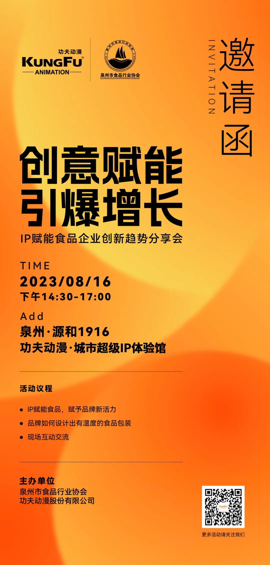 8月16日,由泉州市食品行业协会、功夫动漫股份有限公司主办的“创意赋能,引爆增长”IP赋能食品企业创新趋势分享会将在源和堂功夫动漫城市超级IP体验馆举办,届时将邀请食品行业企业代表共话食品行业创新发展新趋势,共享IP赋能食品企业新理念。