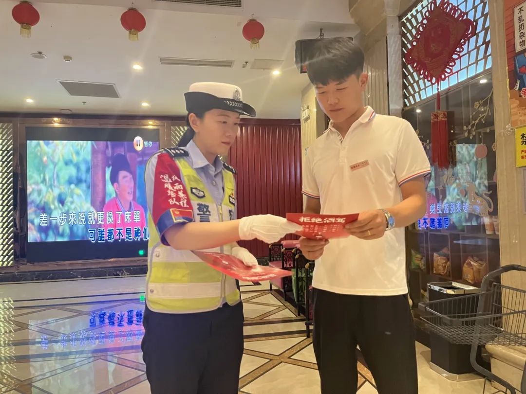 活动中,民警与代驾小哥走进KTV和饭店,将拒绝酒驾宣传材料摆在饭店的收银台、服务台上等明显位置,通过这种直观的方式,在潜移默化中进一步增强餐饮行业、员工及就餐群众的交通安全意识。