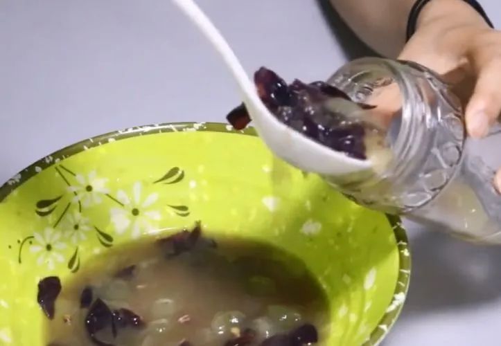 第四:把捏碎的葡萄,倒进干净消毒的玻璃罐中。在倒入葡萄的过程中,要一层葡萄,再倒入一勺的白檀,比例大概5:1。最后再在最上一层散入一点冰糖。