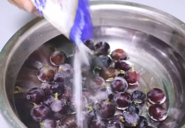 第二:将剪好的葡萄倒入清水中,再倒入小苏打和食盐进行浸泡清洗。食盐有杀菌消毒的作用,小苏打可以除去葡萄表面残余的农药。