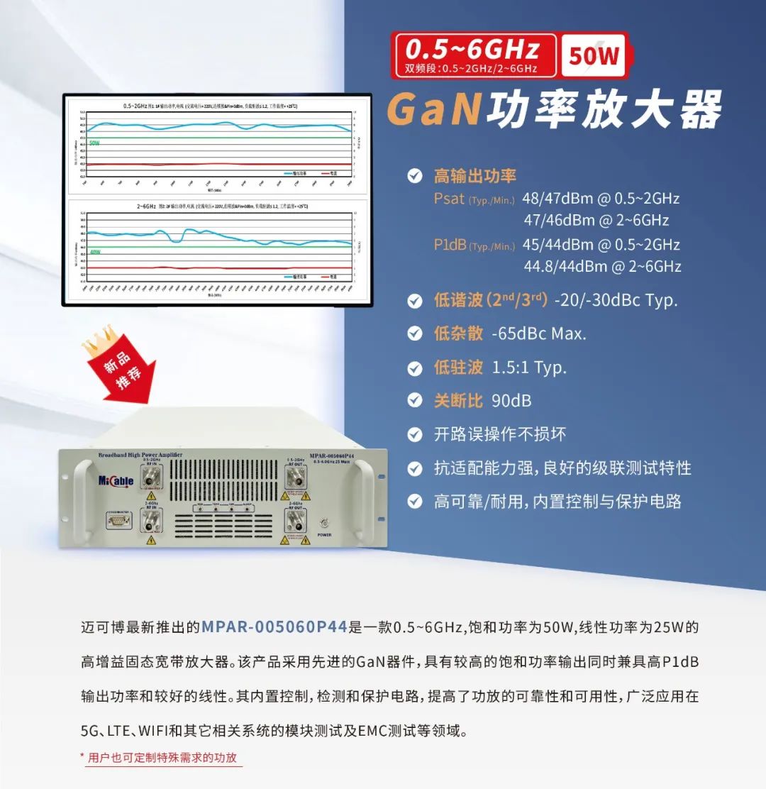 迈可博最新推出的MPAR-005060P44是一款0.5~6GHz,饱和功率为50W,线性功率为25W的高增益固态宽带放大器。该产品采用先进的GaN器件,具有较高的饱和功率输出同时兼具高P1dB输出功率和较好的线性。其内置控制,检测和保护电路,提高了功放的可靠性和可用性,广泛应用在5G、LTE、WIFI和其它相关系统的模块测试及EMC测试等领域。