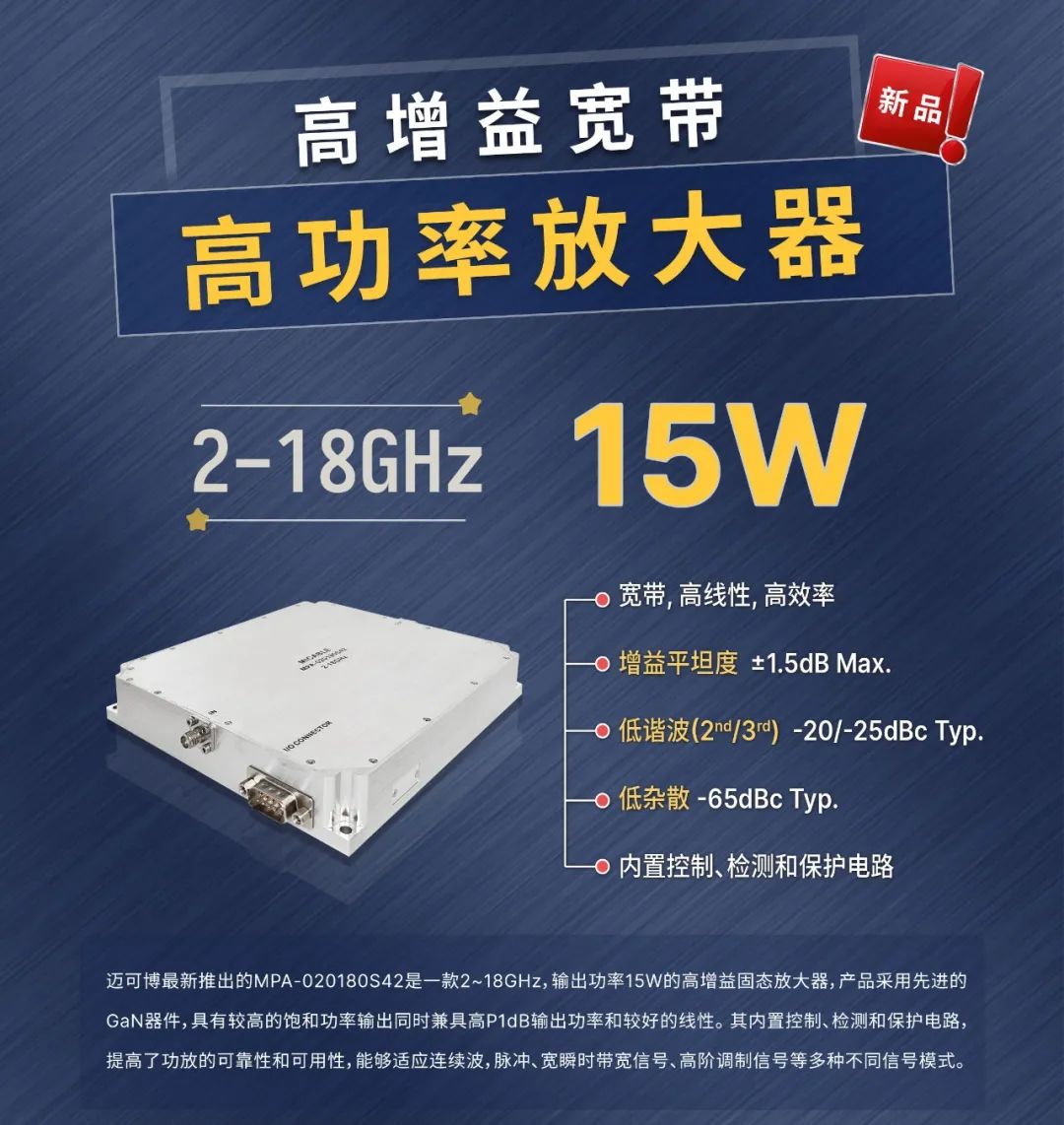 迈可博最新推出的MPA-020180S42是一款2~18GHz,输出功率15W的高增益固态放大器,产品采用先进的GaN器件,具有较高的饱和功率输出同时兼具高P1dB输出功率和较好的线性。其内置控制、检测和保护电路,提高了功放的可靠性和可用性,能够适应连续波,脉冲、宽瞬时带宽信号、高阶调制信号等多种不同信号模式。