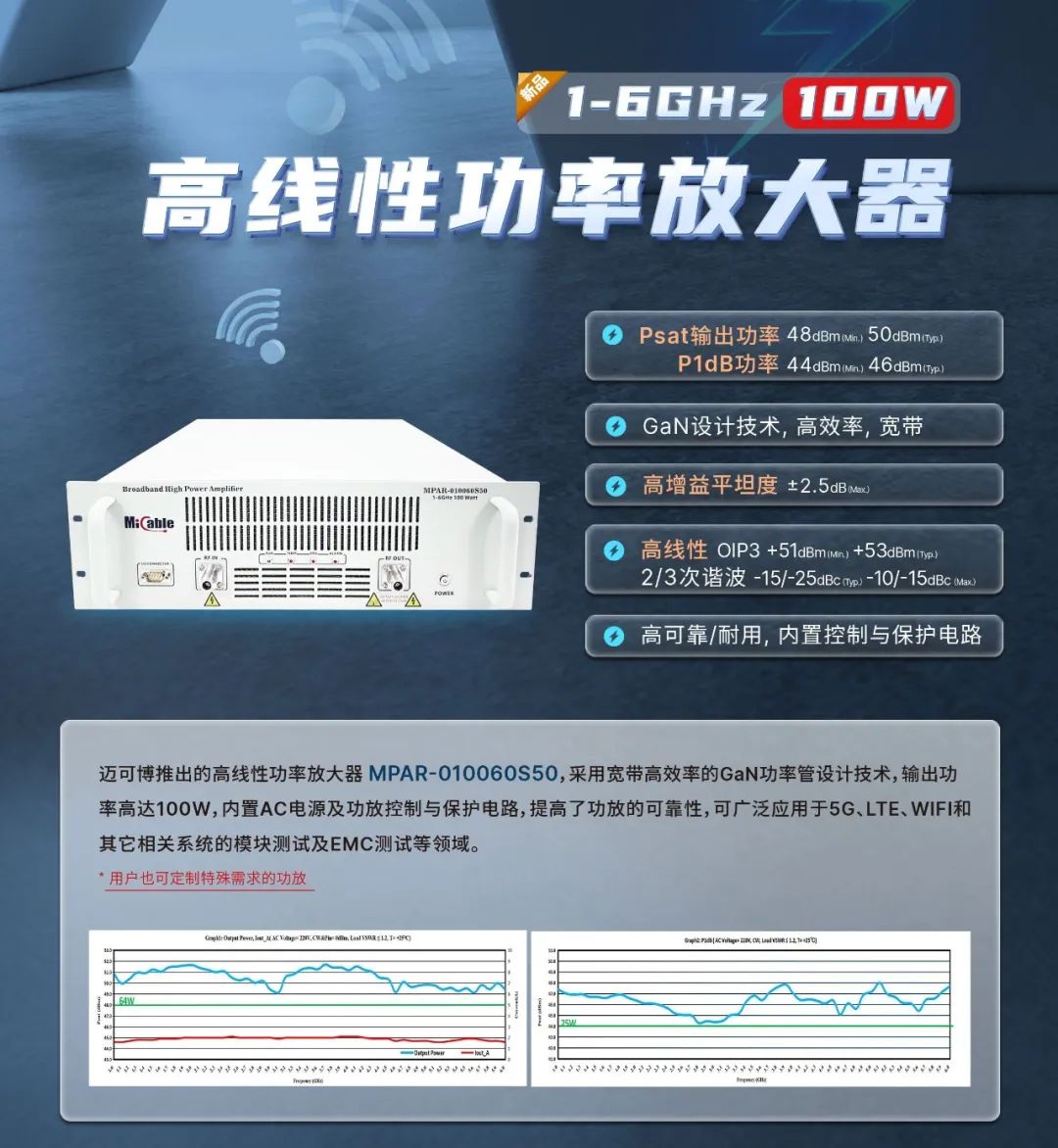 迈可博推出的高线性功率放大器 MPAR-010060S50,采用宽带高效率的GaN功率管设计技术,输出功率高达100W,内置AC电源及功放控制与保护电路,提高了功放的可靠性,可广泛应用于5G、LTE、WIFI和其它相关系统的模块测试及EMC测试等领域。