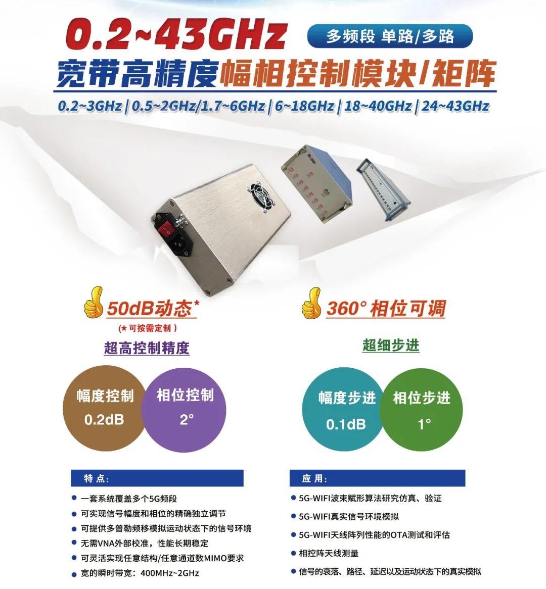 伟博电讯开发的0.2~43GHz超宽带超高精度幅相控制系统,该产品因其创新性被业界权威的微波杂志Microwave Journal选为特色产品,相关技术文章作为特邀文章发表于其2019年12月英文版。产品可以达到0.2dB和2°的幅度控制精度,具有极宽的瞬时带宽,可广泛应用于信道模拟器、高精度的相控阵测量、理想的超宽带高精度MIMO和理想的5G OTA辅助测试及相控阵相关算法等领域 。