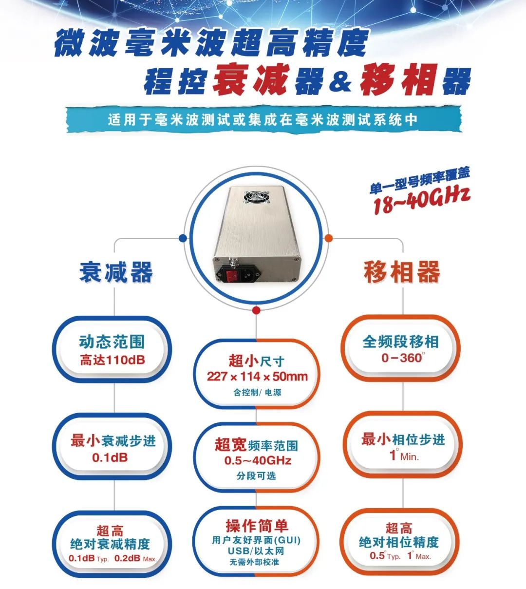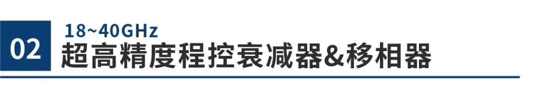 18~40GHz程控衰减器和程控移相器这两大类产品是超宽带超高精度的幅度和相位控制器件,可以实现0.1dB和1º的幅相控制,动态范围有50-110dB可选,相位动态范围为0~360º,该产品已经在星际信号、高精密的衰落控制和相关的5G测试领域得到应用。产品带有提供全套经过校准的控制软件。