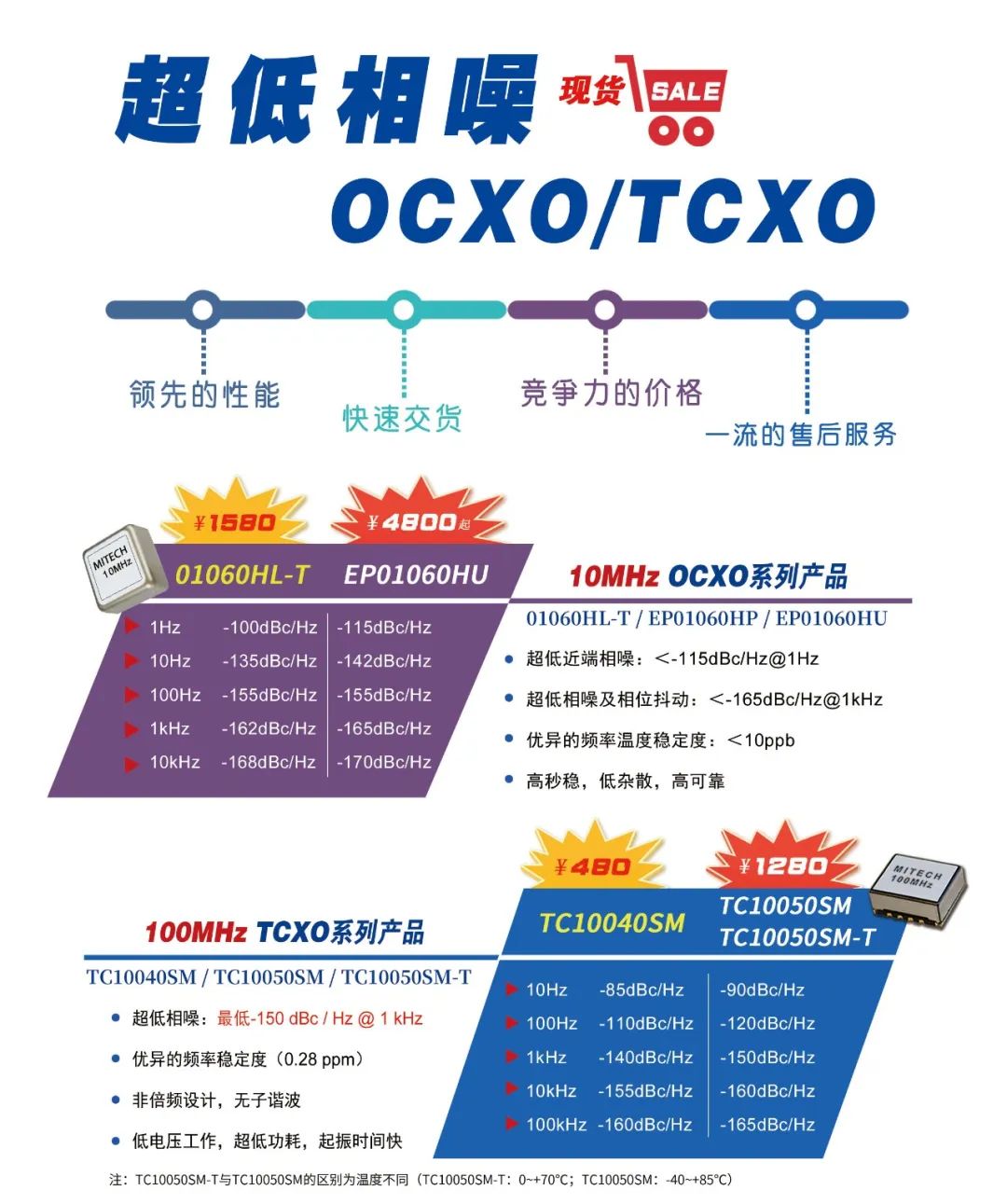 伟博电讯推出了一系列的超低相噪的10M/100M恒温晶振OCXO和100MHz的温补晶振TCXO等产品,具有高稳定度、超低相噪、小尺寸等特点,特别是100MHz的TCXO温补晶振,也能达到-150dBc/Hz@1kHz的超低相位噪声,在很多场合,可取代OCXO应用且具有低成本、低功耗、启动时间快的特点。