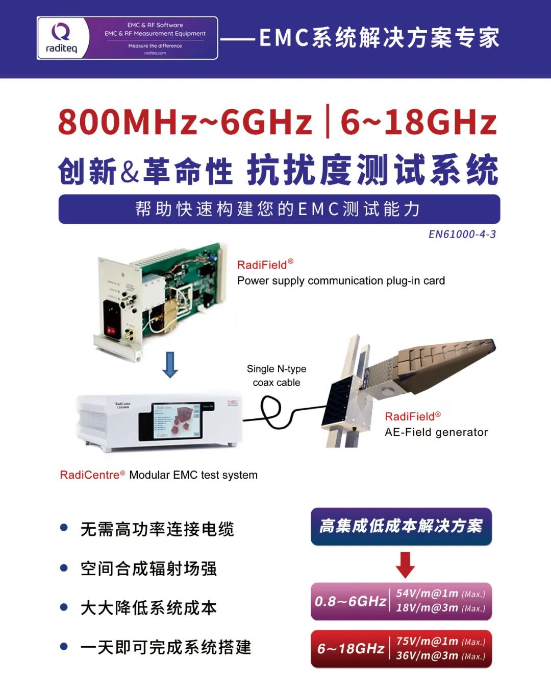 Raditeq是全球EMC测试领域的知名企业,最新推出了创新型高度集成一体化辐射抗扰度测试系统,测试频率上限可到18GHz。系统为用户提供了搭建快速、简单易用、成本极低且性能优良的RS抗干扰测试解决方案。特点是架构简洁,所有的功放、天线、功率计、合路器均被集成一体,频率覆盖800MHz-18GHz,可在空间产生所需场强。
