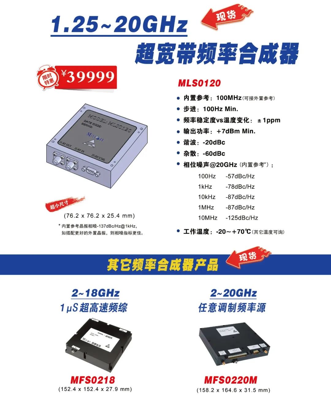 伟博电讯利用创新的技术开发的超小型超宽带的频率合成器可以覆盖1.25-20GHz的频率范围,内置参考源(同时可接外参考控制),具有小型化、超低杂散等特性,可以满足各种苛刻的环境要求。