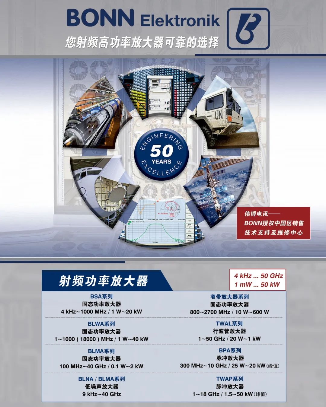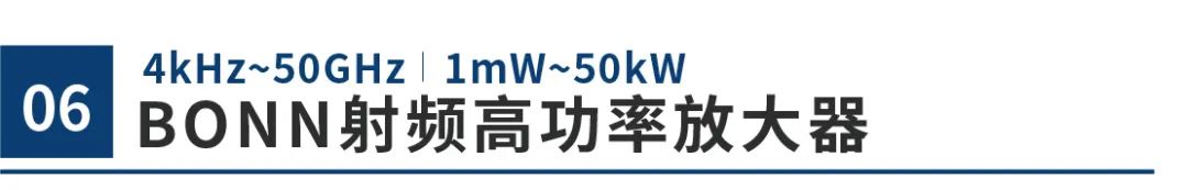 德国BONN是全球著名的高功率放大器生产商,设计和生产宽带射频高功率放大器及射频高功率放大器系统,产品在EMC电磁兼容和各种高功率微波测量领域享有极高声誉。频率覆盖范围4kHz到50GHz,与同类产品比较,产品体积小、频率宽、可靠性高!