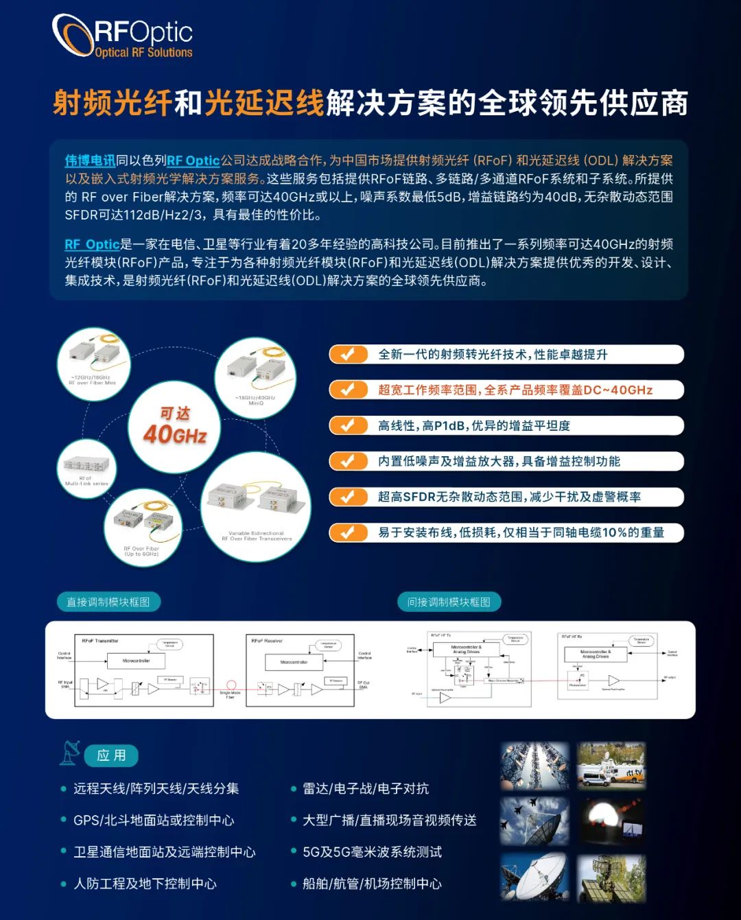 伟博电讯同以色列RF Optic公司达成战略合作,为中国市场提供射频光纤 (RFoF) 和光延迟线 (ODL) 解决方案以及嵌入式射频光学解决方案服务。这些服务包括提供RFoF链路、多链路/多通道RFoF系统和子系统。所提供的 RF over Fiber解决方案,频率可达40GHz或以上,噪声系数最低5dB,增益链路约为40dB,无杂散动态范围SFDR可达112dB/Hz2/3, 具有最佳的性价比。