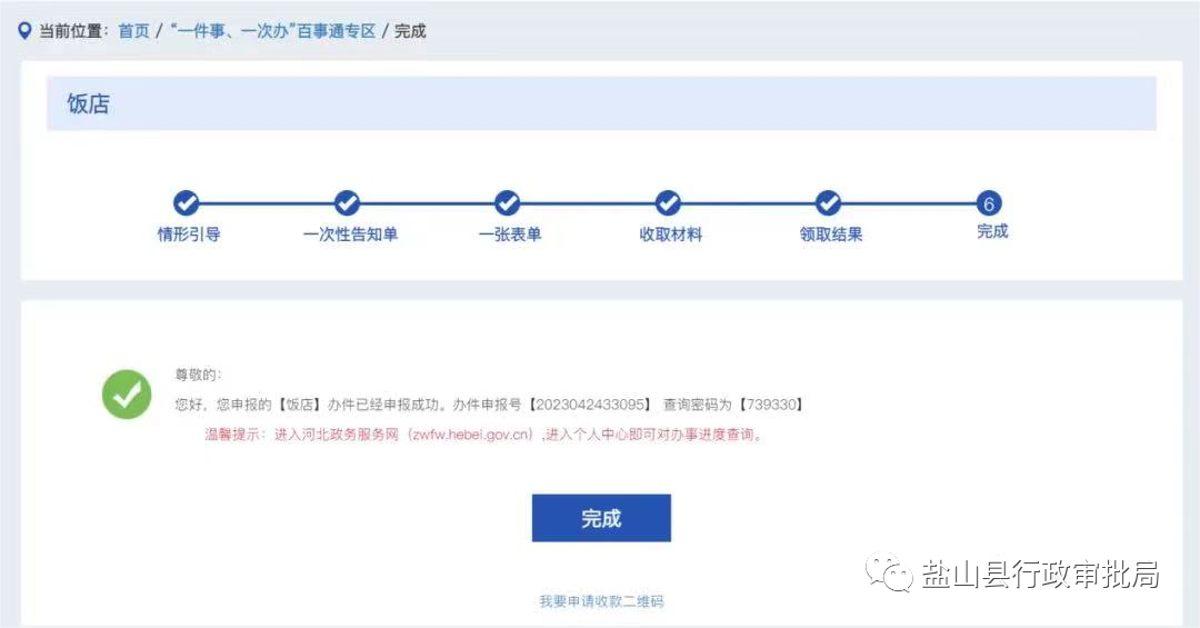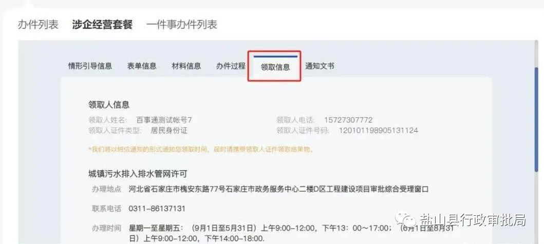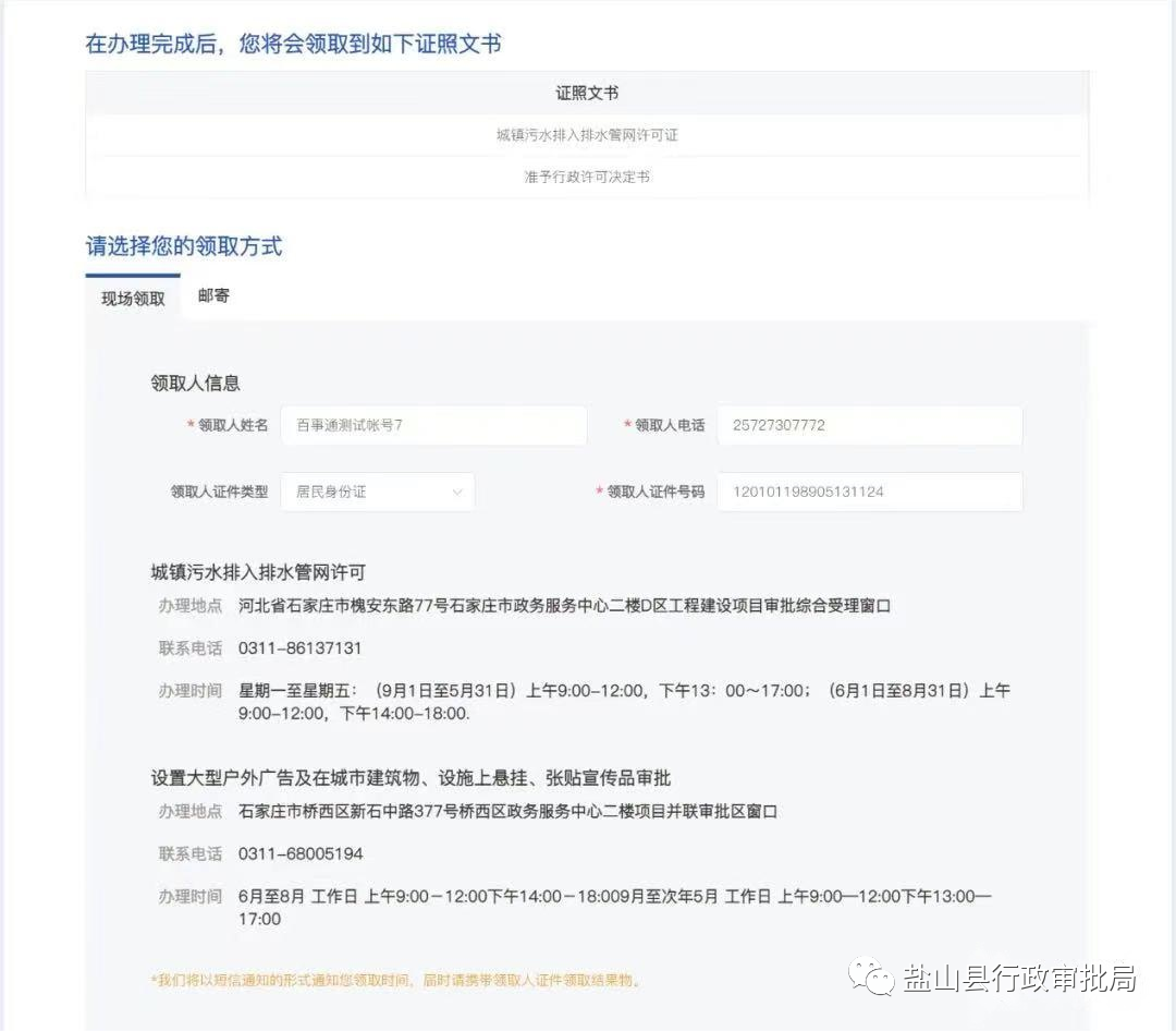 10.领取审批结果。审批环节完成后,您会收到证照领取的短信通知,按照通知前往政务大厅现场领取,或等待快递送达(部分地区支持)。