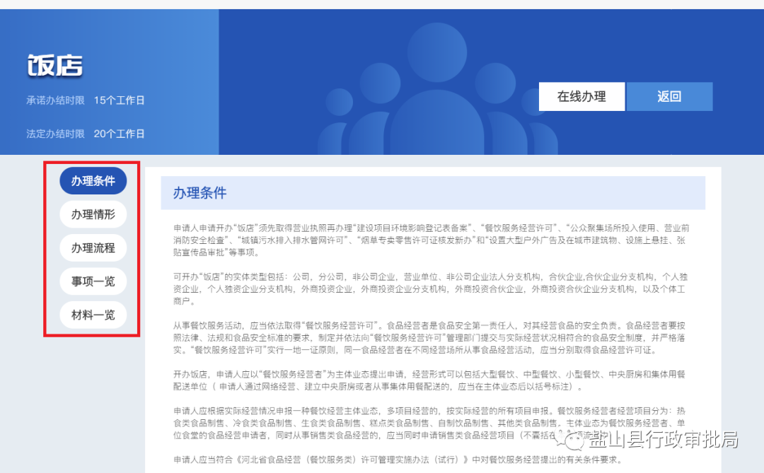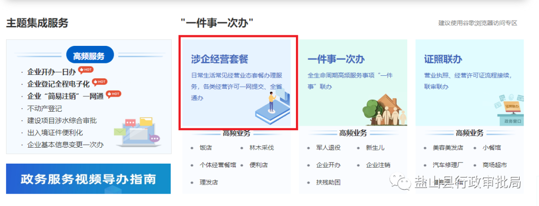 2.在网站首页找到“涉企经营套餐”主题专区,进入专区,在“我要开店”分类下找到“饭店”套餐,点击“饭店”后,进入开办饭店办事指南,您可以在此详细查看开办饭店需具备的申请条件、需办理的事项、审批流程、需准备的材料以及导办视频等。