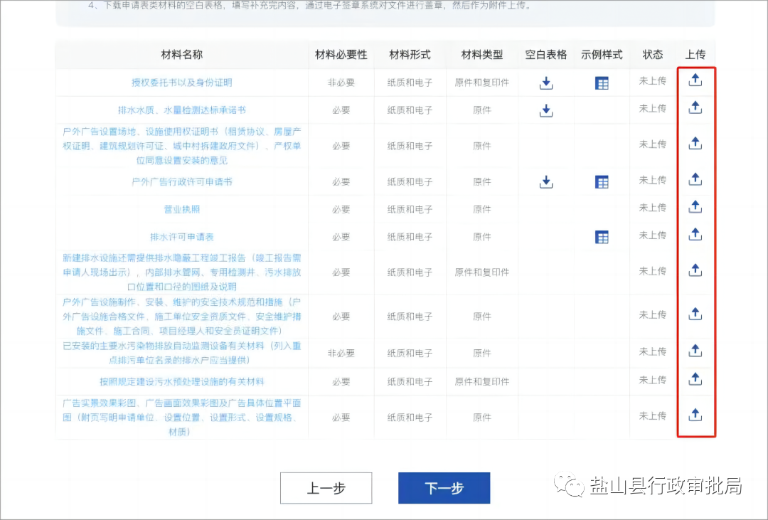 7.上传申报材料。您需要逐个上传准备好的材料,所有必要材料必须上传,非必要材料选择性上传。必要材料全部上传后点击“下一步”。