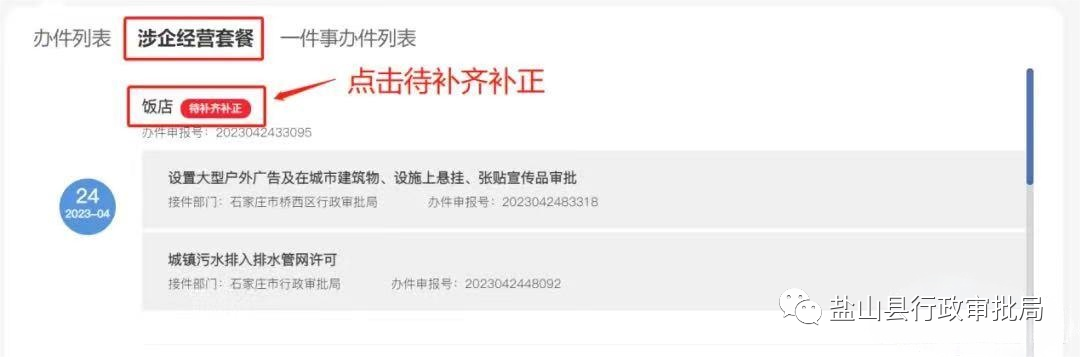 您申报完成后,每个审批环节都会短信通知您,如通知您补齐补正材料,您需要进入河北政务服务网-用户中心-涉企经营套餐办件列表中及时进行材料补齐补正并提交;