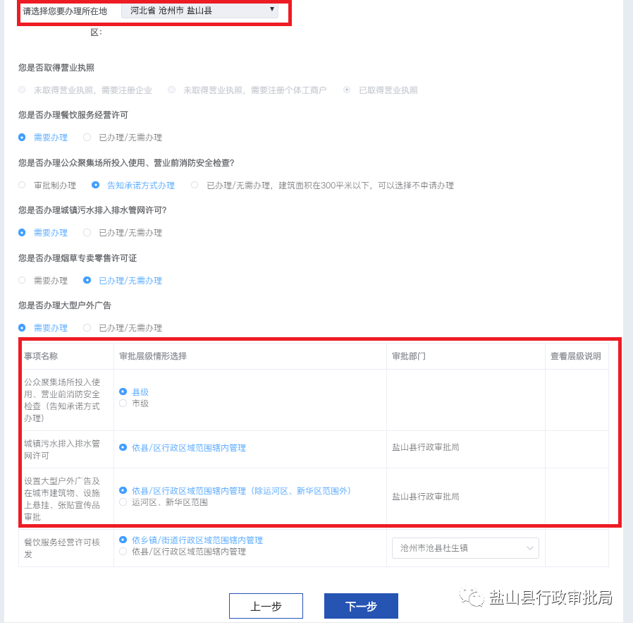 4.按照情形引导,选择办理事项。您首先选择公司开办的区域,然后根据您的经营项目选择需要办理的事项,系统会自动列出您所选事项的审批部门,您也可以结合自身实际,按照审批层级的情形说明,自行选择审批部门。确认无误后点击“下一步”。