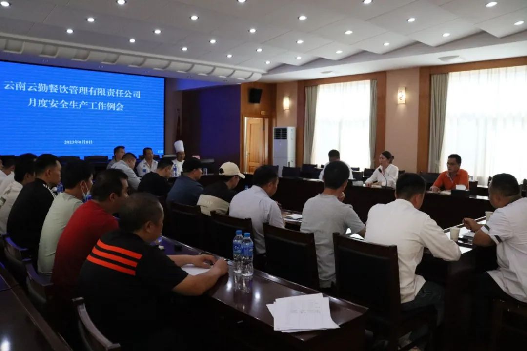云勤餐饮公司7月月度质量安全工作例会于8月8日在集团三楼会议室召开,生产安全部、品控研发部、各项目厨师长及安全员等参加会议。餐饮公司总经理张寿全出席会议并讲话。