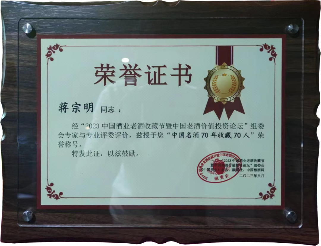 在此次盛会中,蒋宗明先生荣幸地入选了“中国名酒70年收藏70人”名单,成为其中的一员,并因其杰出贡献而获得了这项殊荣。