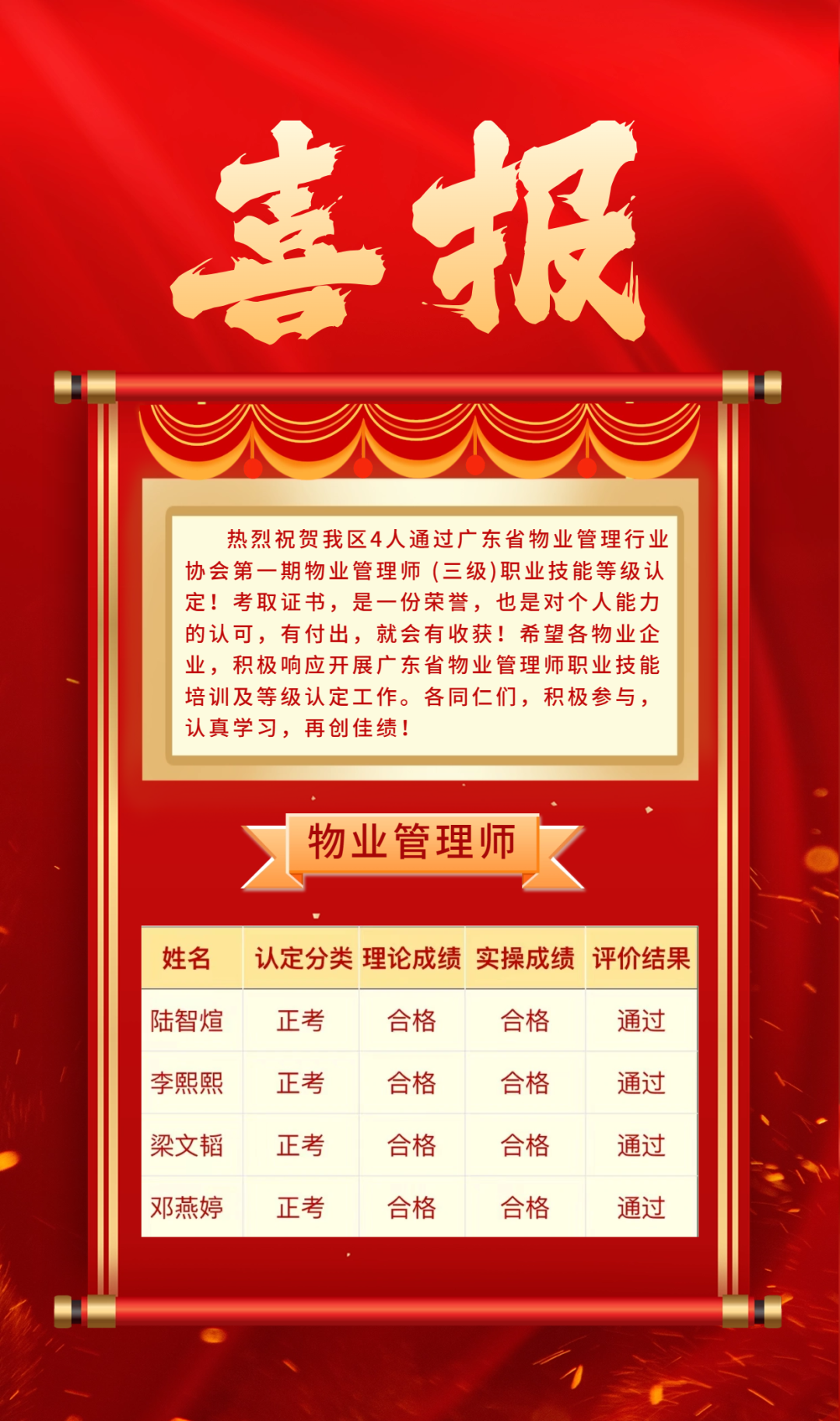 热烈祝贺我区4人通过广东省物业管理行业协会物业管理师 (三级)职业技能等级认定考试