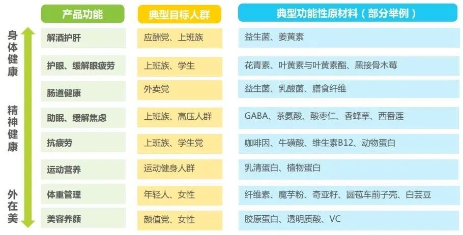 所以,近几年火热流行的零卡糖气泡水,电解质水,还有各种含有益生菌、玻尿酸等具备养生、美容、辅助清肠等功能的奶制品、糖果、饮料等功能性食品层出不穷,都是为了满足当下年轻人想要美白、助眠、不脱发等多样化的健康诉求。