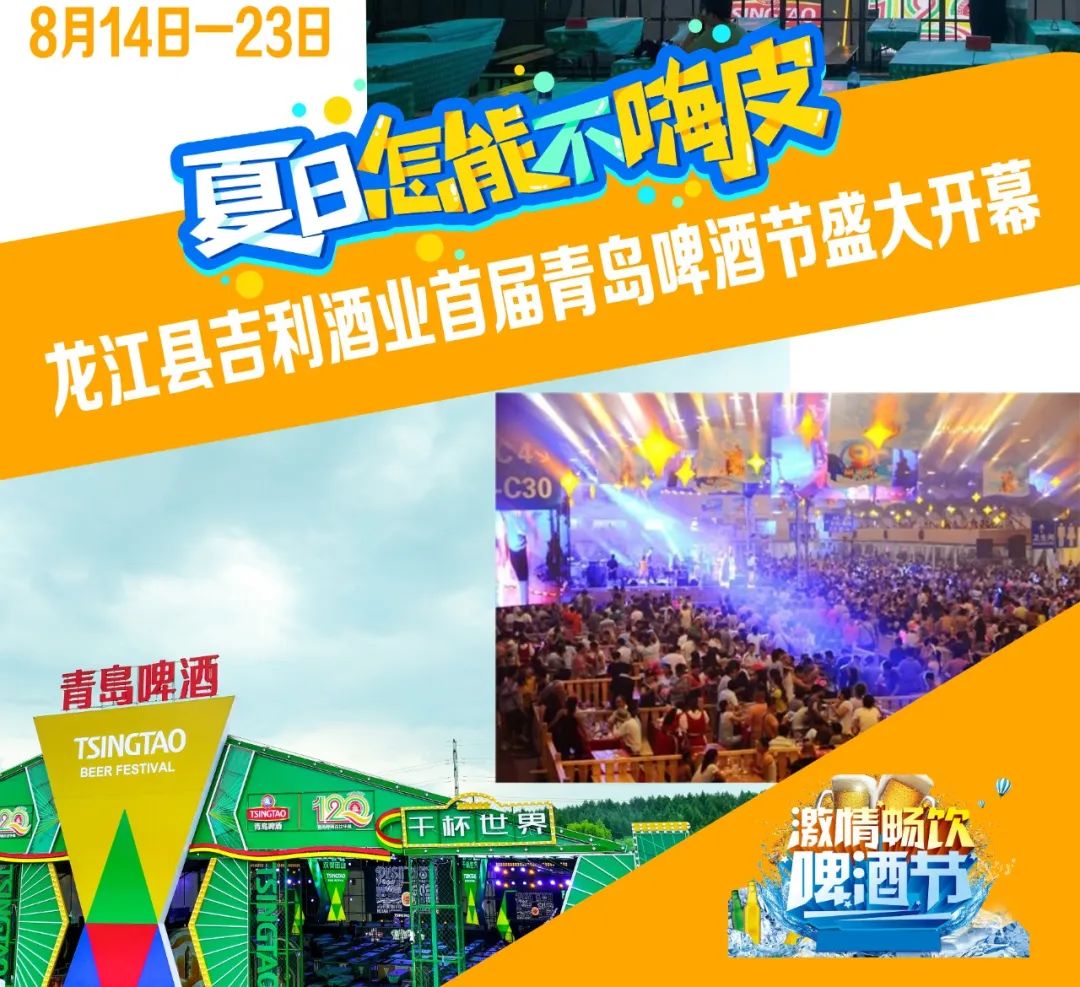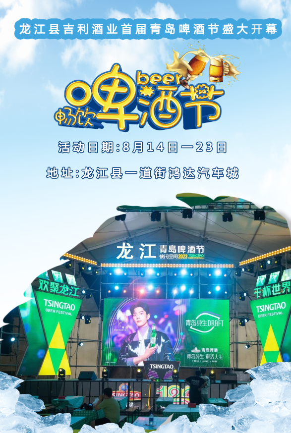 龙江县吉利酒业首届青岛啤酒节盛大开幕,活动日期:8月14日一23日 地址:龙江县一道街鸿达汽车城