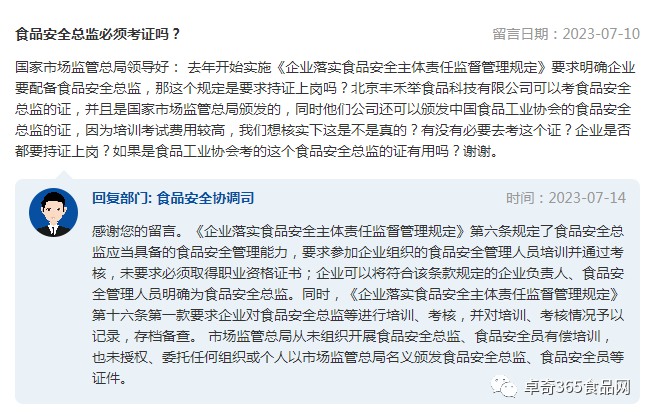 食品安全总监必须考证吗?7月14日,市场监管总局作出回复。