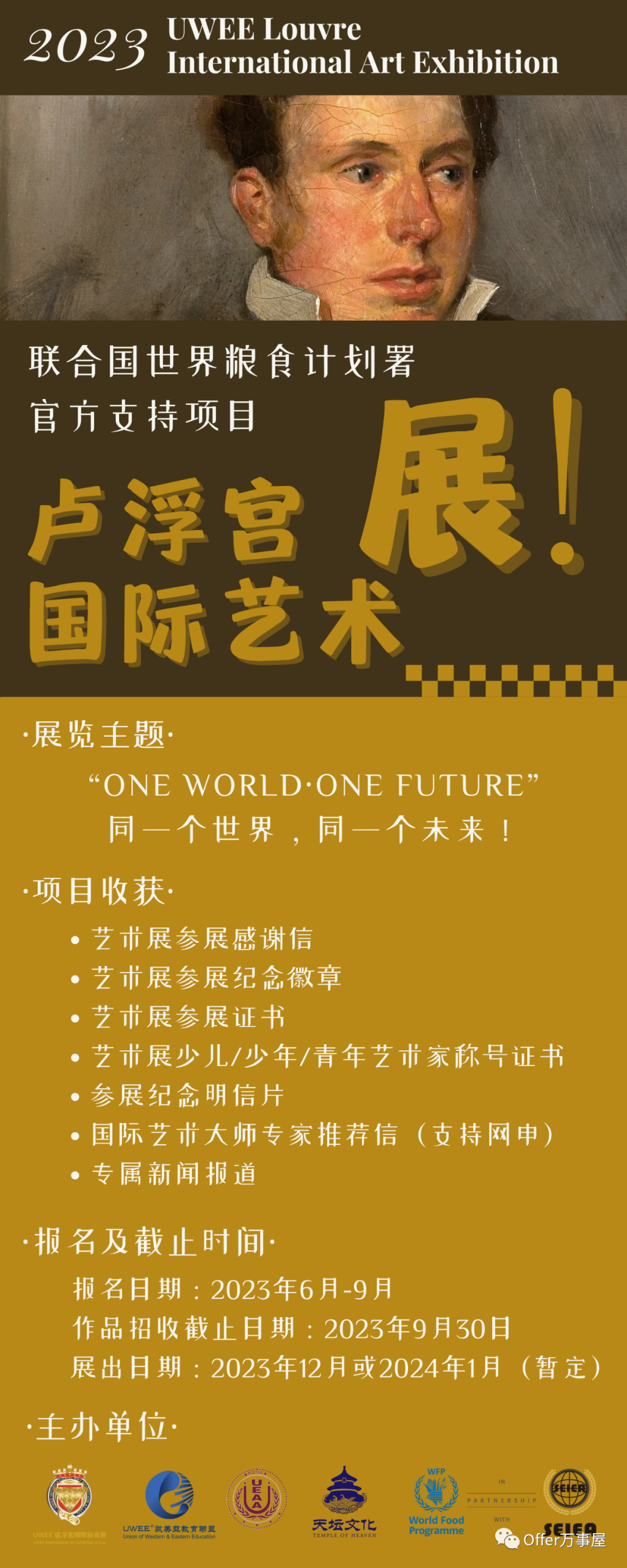 经联合国相关单位组织支持,2023 UWEE 卢浮宫国际艺术展将与联合国世界粮食计划署合作共同举办国际艺术展,入选作品将在卢浮宫举办的一年一度的国际性艺术展会中进行展示,分为儿童板块和青年艺术家板块。