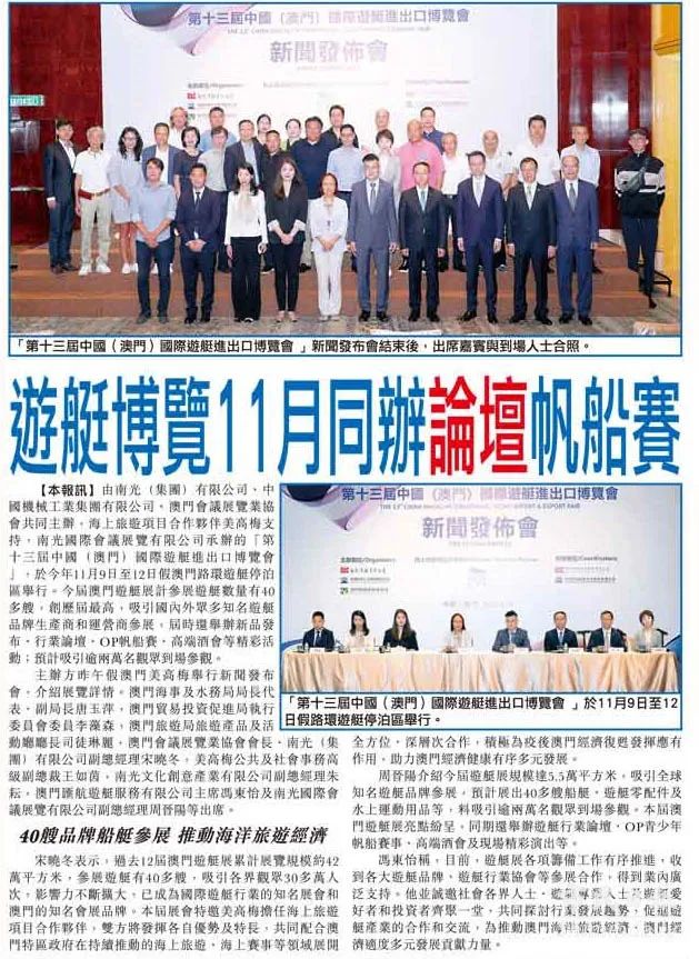由南光(集團)有限公司、中國機械工業集團有限公司、澳門會議展覽業協會共同主辦,海上旅遊項目合作夥伴美高梅支持,南光國際會議展覽有限公司承辦的「第十三屆中國(澳門)國際遊艇進出口博覽會 」,於今年11月9日至12日假澳門路環遊艇停泊區舉行。今屆澳門遊艇展計參展遊艇數量有40多艘,創歷屆最高,吸引國內外眾多知名遊艇品牌生產商和運營商參展,屆時還舉辦新品發布、行業論壇、OP帆船賽、高端酒會等精彩活動;預計吸引逾兩萬名觀眾到場參觀。