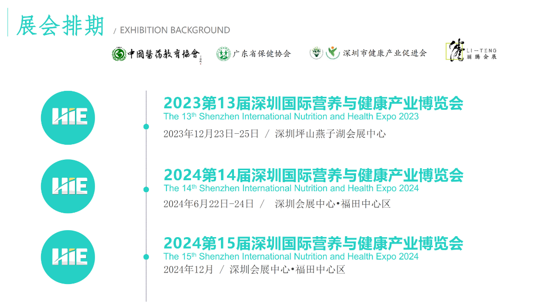 为了贯彻党中央“健康中国”战略,搭建全球大健康展示和交互平台,促进大健康产业可持续发展,深圳国际营养与健康产业博览会每年在深圳举办两次。展会充分体现市场化办展新模式,旨在展示大健康领域新产品、新技术、新成果,成为凝聚大健康领域的国际合作共识、协同促进大健康产业创新发展的重要平台。