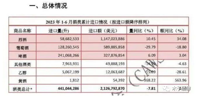 7月份,根据中国食品土畜进出口商会酒类进出口商分会发布的2023年1-6月进口酒类市场情况数据显示,进口酒市场相比去年有所恢复,虽然量有一定下降,但额度相较,都有一定增加。不同酒品类表现各不相同。