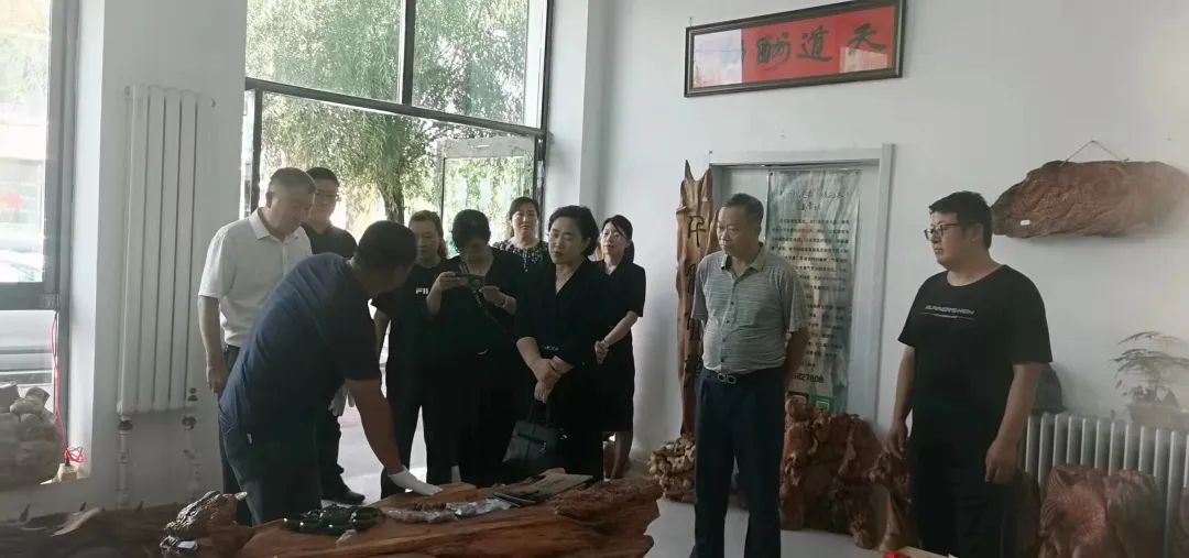 调研组在市政协副主席舒洁的带领下,先后实地走访了我区文化创意产业园北沉香根雕木艺工作室和北派根雕制作厂,就我区文化创意产业发展情况进行细致了解。在北沉香根雕木世工作室,各位委员详细了解了以东北红松沉香为原材料而制作出的创意作品的制作技艺、创作构思以及工艺处理、销售渠道等情况。在和林木业有限公司,委员们与获得双鸭山市第三批市级非物质文化遗产保护项目代表性传承人朱兆刚交流时了解到,北派根雕制作技艺就是以树根(包括树身、树瘤)的自然形态为艺术创作对象,通过构思立意、艺术加工及工艺处理,创作出人物、动物、器物等艺术形象作品。