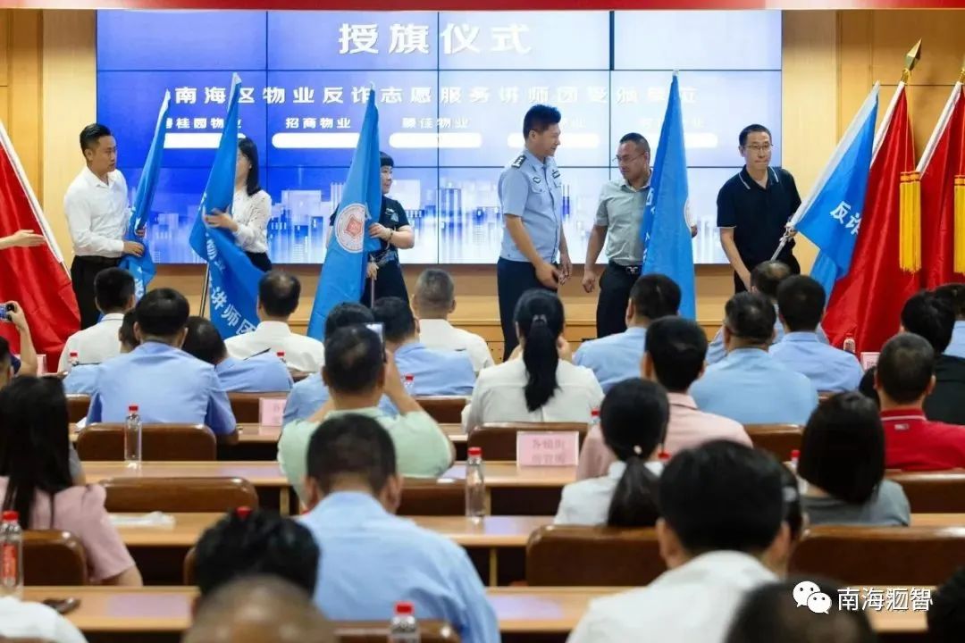 南海区公安局刑侦大队大队长麦润强为臻佳物业、国安物业、时代物业、招商物业、碧桂园物业反诈志愿队授旗。