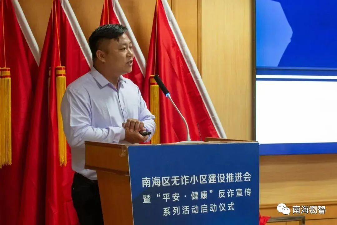 南海区公安分局党委委员、副局长姜韬发言。他表示近年来,电信网络诈骗犯罪高发、频发,为保护人民群众财产安全和合法权益,维护社会秩序,佛山市公安局南海分局将持续加大全警反诈、全民反诈力度,根据《佛山市“无诈社区”创建工作方案》的要求,在全区大力开展“无诈社区”创建工作,这次联动各派出所、镇街房管所、物业管理协会三方力量,努力构建党委领导,政府主导,部门主责,行业监管、有关方面齐抓共管的整体格局。南海区内各派出所将当好创建活动的“火车头”、“主力军”和“协调员”,共同推进“无诈小区”创建工作提质增效。