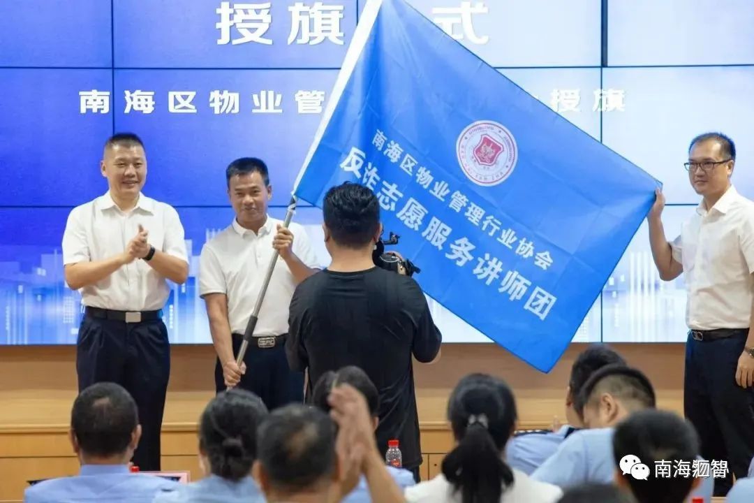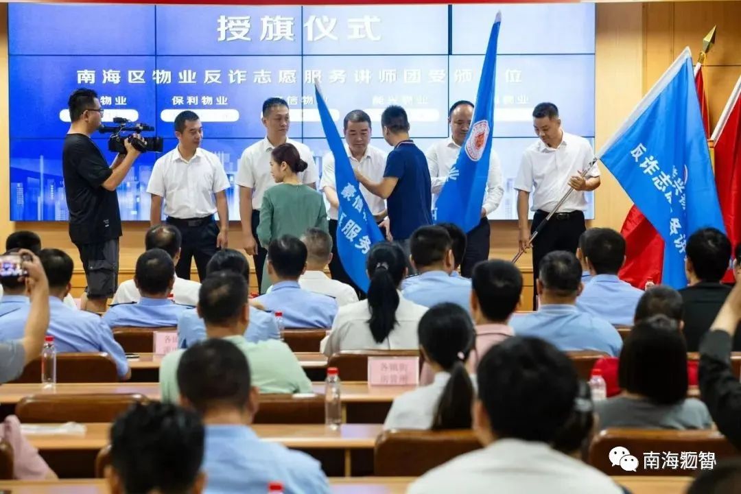 南海区住建水利局物业管理科长刘剑桢为豪信物业、能兴物业、中海物业、保利物业、万科物业反诈志愿队授旗;