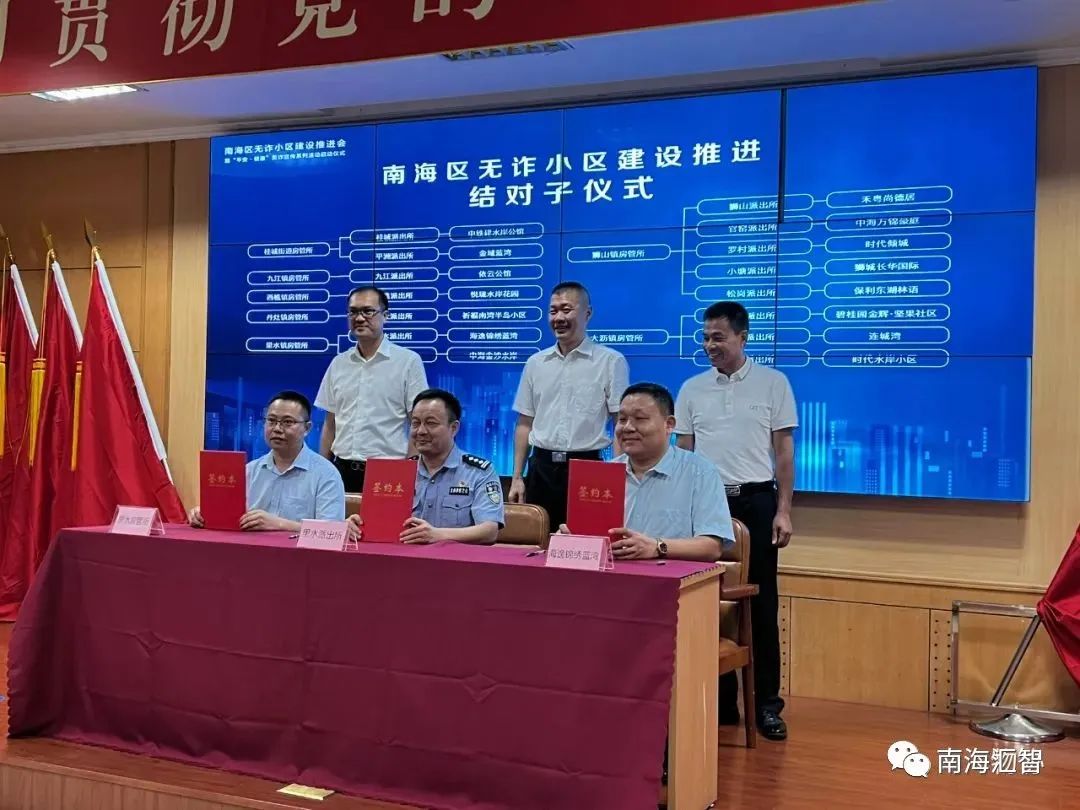 会议上,南海区15个派出所、7个镇街房管所以及15个典型物业小区进行“无诈结对”签约仪式。共同吹响了“防诈骗、爱健康”创建“无诈小区”的战斗号角,里水镇房管所、里水派出所及海逸物业作为代表上台签约。