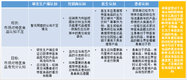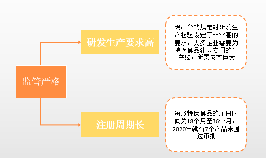 近年来特医食品相关政策的大量发布,预示着中国特医食品市场将更加规范与完善,市场渗透率也将在短期内显著提升特医食品相关企业、产品、院内院外场景,将随着市场的规范与完善化发生模式上的变化。2016年发布的《特殊医学用途配方食品注册管理办法》是特医食品行业发展的催化剂,但同时加大的监管力度导致特医食品行业的进入壁垒高一一难度高、成本高、时间长,这对中小型企业来说无疑是难上加难。由于严格的监管和未完善的政策,产品面市难度高,且流通渠道不规范。特医食品在我国仍需普及认知,市场的认知不足问题主要存在于研发生产企业、经销商、医生及患者当中。特医食品在我国流通需要标准化,比如应当以明确身份通过医生处方的形式在医院的临床科室应用。而目前看来,认知不足与标准缺失将阻碍我国特医食品行业的发展。随着国家对临床营养的重视,特医食品市场将逐步规范化、特医食品作为能够帮助实现《“健康中国2030”规划纲要》和《国民营养计划2017-2030》中营养相关目标的产品,一直被国家所重视近年特医食品相关政策的大量发布,预示着中国特医食品市场将更加规范与完善,市场渗透率也将在短期内显著提升特医食品相关企业、产品、院内院外场景,将随着市场的规范与完善化发生模式上的变化。 具备强研发能力、强资本、强渠道支撑的企业才能嘉立于行业;不合规企业将被摘掉特医标签不规范现象将逐渐消失。 特医食品总体的产品数量与多样性会持续快速增加,尤其是全营养配方食品、特定全营养配方食品与婴儿特医食品。并且,TY批号产品将成为我国用于临床营养支持的主流产品。 特医食品在院中地位的明确化和临床营养诊疗方式的完善化会导致特医食品在院端需求的大量增加。 由于特医食品需求的不断上升,特医食品市场院外流通规模也将会不断扩大。并且,随着大众认知度提高,长期使用特医食品的患者会趋向于在院外自行购买特医食品,进而满足消费偏好。产品:国内特医产品数量与多样性将会在短期快速增加TY批号,产品将成为我国用于临床营养支持的主流产品从产品角度出发,在国家的重视与政策的完善下,特医食品总体的产品数量与多样性会持续快速增加,其中全营养、特定全营养与婴儿特医食品将会作为第一批进入快速增加阶段的产品此外,特医食品将成为用于临床营养支持的主流产品,其他非特医批号产品将不再用于临床营养支持。全营养配方食品研发生产需求相对其他特医产品较低,且其生产标准相对统一。因此,全营养配方食品的数量在近几年内将持续快速的增加,并且产品同质化将继续加重,最终进入完全竞争市场。全营养配方食品的渠道与营销将会是决定其产品成败的关键。 特定全营养配方食品将会在一年内陆续获批、且在两年至五年内井喷式爆发 2019年9月,国家市场监督管理总局发布了针对糖尿病、肾病、肿瘤的《特定全营养配方食品临床试验技术指导原则》 (简称《临床指导原则》) 。目前已有相关企业按照此原则指导进行临床试验,截至目前国内市场只有1款特定全营养食品注册成功。同时,首批《临床指导原则》的发布代表着特定全营养配方食品告别了有产品无临床指导原则的窘境.随着今后逐渐细化与多样的特定全营养配方食品原则的发布,更多种类与更多数量的特定全营养配方食品将会成功通过临床试验阶段。预计两年至五年内,特定全营养配方食品将会井喷式爆发。 婴儿特医食品将会在短期内持续大量获批且多样性持续增加 目前,许多企业正在致力于将其已有的婴儿功能性特医食品重新注册为婴儿特医食品,通过特医批号证明其对拥有特殊体质或疾病婴儿的适用性,以及产品的高质量与安全性由于重新注册需要时间相对较短,预计短期内,更多婴儿特医食品会出现在市场上。另外,由于婴儿对特医食品的需求大且多样,目前市场上已有产品数量种类还会继续增加,进而满足不同婴儿的特定营养需求。