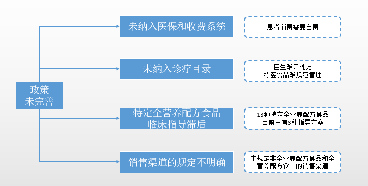 TY批号的特医食品将成为我国用于临床营养支持的主流产品 随着特医食品政策的逐步完善,为了方便特医食品统一化管理,我国将来可能会发布鼓励肠内营养制剂重新注册特医食品批号的相关政策,肠内营养制剂 (药品批号) 将被归于特医食品 (食品批号)。同时,由于保健食品与其他普通食品的制造目标并不是为患者提供临床肠内营养支持,它们将不会在流通终端被当做特医食品使用。保健食品和其他普通食品中符合TY批号标准的产品也会重新申请TY批号,以便在应用端被使用。院内场景: 临床营养诊疗方式完善化和特医食品(食品院内地位明确化将导致特医食品在院内需求的大量增加) 由于目前国家对临床营养的重视,以及近年来各种特医食品政策的发布与完善,特医食品在院中地位的明确化和临床营养诊疗方式的完善化将是未来的趋势,这样的趋势会导致特医食品在院端需求的大量增加。 国家对国民营养的逐渐重视将会率先使北上广深四大城市拥有营养科的三级医院占比会大幅提高,院内临床营养执业医师的数量也会大幅上升。 国家政策的完善以及学术界对临床营养的逐渐重视也将推动其他非营养科的医师学习更多营养相关知识。临床营养相关基础知识将成为医生必备知识,临床主治医师将能够做到针对不同健康状态患者选择合适的临床营养支持方法,或配合营养科进行临床营养筛查,最终提升患者的治愈率。 随着政策的引导与人们对临床营养作用的认知的普及,中国的医院中也可能建立与美国相似的由营养师,医生,护士等构成的临床营养支持小组,保证患者的营养状态良好。随着医院对临床营养不良患者的诊疗方式完善化,以及特医食品在医院地位的明确化,特医食品在院端的使用的阻碍将会逐渐消失,越来越多的患者将会通过使用特医食品得到更适合的营养支持。 纳入医院正规收费系统 特医食品将分品类逐步纳入医院收费系统目前河北,四川,江苏政府已经发行了特医食品纳入医院正规收费系统相关的征求意见稿或试行方案。 与目前院内所使用的肠内制剂相同,特医食品 也会因其对患者的临床营养重要性被纳入到医保报销的范围。其中,由于特定疾病状态下患者对特定全营养特医食品的强需求,其会率先进入医保报销范围。目前,浙江省已经将针对于苯丙酮尿症的特医食品纳入医保范围。 未来,特医食品 (食字号) 的采购与管理将与药品相同,从营养科转变到药剂科。营养科室与其他专科科室一样将会将其中心放在对患者的诊疗上,并非特医食品的招标采购。院外场景: 特医食品销售重心走向院外药店成为院外主要渠道,线上销售政策细化并趋于规范 药店是企业在院外布局的重心其他线下渠道未来几年有望走向规范 相比超市等,药店(尤其是连锁品牌药店)产品种类分布较全,而且由于患者对于特医食品的认知和购买意向是来自医院/医生,药店将成为他们购买特医食品的首选。可以预见,药店作为消费者最信任的院外购买营养品和药品的规范渠道,也将成为特医食品企业在院外布局的重心。特定全营养配方食品网售放开,外资婴儿特医食品仍占主流随着相关政策不断细化,特医食品的线上销售会逐渐规范特定全营养配方食品的网络销售将会参考处方药网售来进行严格监督和规范管理;而外资企业的婴儿特医食品在线上渠道已经建立的优势,在未来几年内难以打破。 超市方面,目前只有华润万家BLT等大型连锁超市有特医食品在售。母婴店在全国各地的数量多而杂,销售标准难以统一。因此,特医食品在超市、母婴店的销售在短期内难以规范。但从长期来看,随着特医食品的普及度和需求上升,更加严格的流通政策会促使特医食品在这些渠道的销售逐渐规范有序。 由于特医食品需求的不断上升,其院外流通规模也将会不断扩大。并且,随着大众对特医食品的认知度提高,消费者开始趋向于在院外自行购买特医食品,从而满足消费偏好(例如价格和口味等)。 线上流通:特定全营养配方食品网上销售终会解禁特医食品企业探索网售新模式 特定全营养配方食品网售放开,外资婴儿特医食品仍占主流 随着相关政策不断细化,特医食品的线上销售会逐渐规范特定全营养配方食品的网络销售将会参考处方药网售来进行严格监督和规范管理;而外资企业的婴儿特医食品在线上渠道已经建立的优势,在未来几年内难以打破。品牌依旧是特医食品线上流通的关键点。未来,特医食品企业 (尤其是大部分缺乏品牌认知度的中资企业) 为了建立本身品牌效应,将趋向于自建渠道 (官方网上商城、开发小程序等)进行网络销售,进而增加客户粘性与忠诚度。