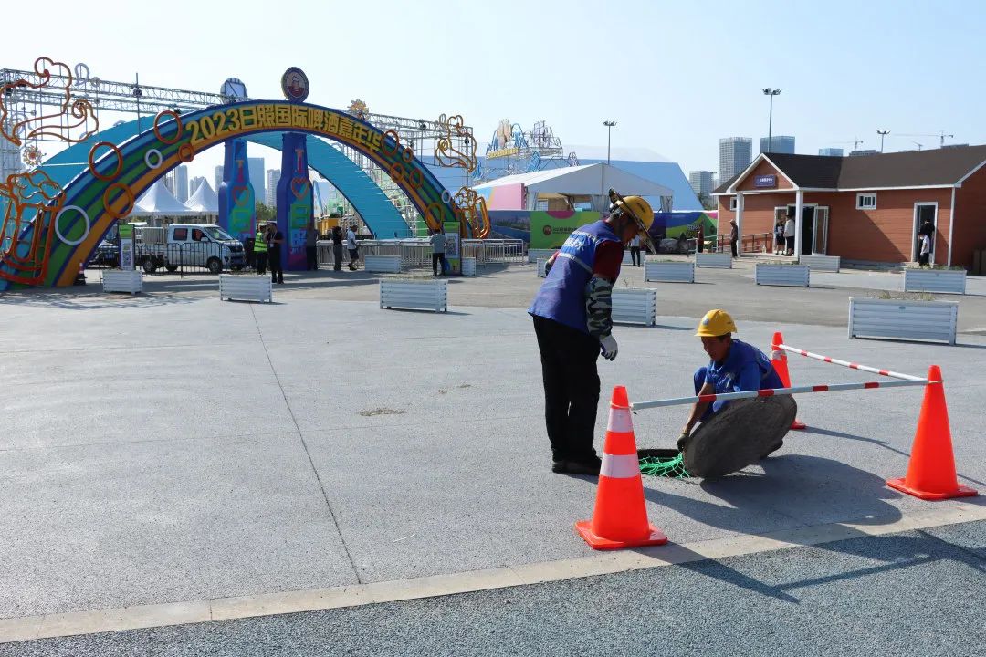 公司网格员对会场临近的海天二路、悦海路、东营路等道路及悦湖湾区域的雨水污水检查井、雨水箅子以及周边河道闸门、泵站等排水管网设施加密巡查维护频次,并对泻湖周边开展06:00-07:00时间段的早巡查工作。同时加强施工盯防,并暂停会场周边的排水管道接设工程,确保啤酒嘉年华期间排水管线稳定运行、排水通畅,积极配合主办方做好会场排水服务。