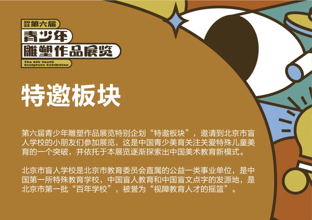 2023第六届青少年雕塑作品展览特别企划“特邀板块”,特别邀请到“北京市盲人学校”的小朋友们参加本次展览,这是中国青少年美育关注特殊儿童美育的一个突破,也是依托于本展览逐渐探索出的中国美术教育新模式。