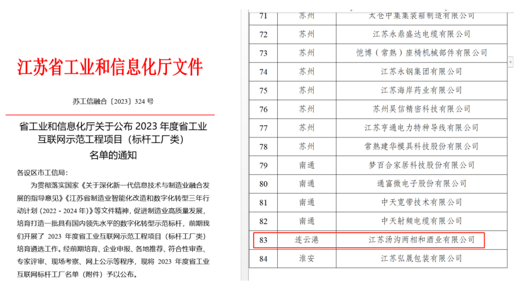 2023年8月10日,江苏省工信厅发布《关于2023年度省工业互联网示范工程(标杆工厂类)拟认定名单公示》,汤沟酒业成功入选,是2023年度连云港市唯一一家入选企业。