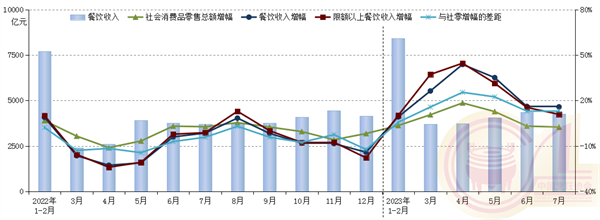 据中国烹饪协会分析,7月份,全国餐饮收入、限上餐饮收入增速分别较上年同期上涨17.3个、12.1个百分点,餐饮收入占社会消费品零售总额的11.6%。1-7月份,全国餐饮收入、限上餐饮收入增速分别比上年同期上升27.3个、28.2个百分点;餐饮收入增幅领先社会消费品零售总额增幅13.2个百分点。