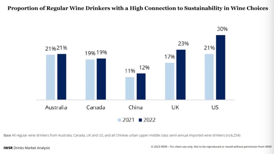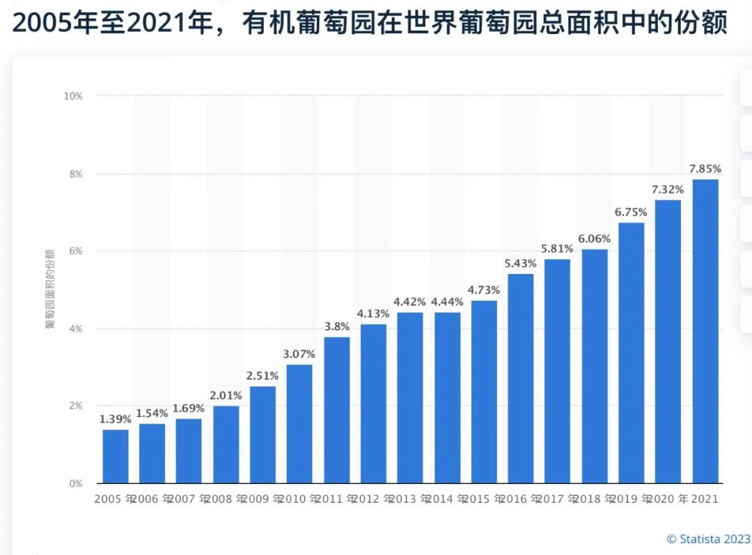 2020年IPSOS的一项调查显示,欧洲的有机葡萄酒消费平均水平约为35%,德国和英国围绕在平均水平,54%的法国消费者饮用了有机葡萄酒(高于2015年的38%)。近日,IWSR国际葡萄酒及烈酒研究所也发布了最新调查报告,2017-2022年,全球有机葡萄酒销售量年均增长5%,其中美国的年均增长率为7%,英国为6%,中国市场以高达8%的年增长率小跑领先。并且消费主力军正从父辈平缓向千禧一代(25-35岁间)转移,新一代的生态理念对整体消费大环境的推动形成一股强劲的冲击力。在过去的几年里,有机葡萄酒市场不断增长,现已从利基市场(小众)过渡到主流市场,如今这种转变不仅在瓶装葡萄酒板块,同时也显著反映在大宗葡萄酒的贸易上。