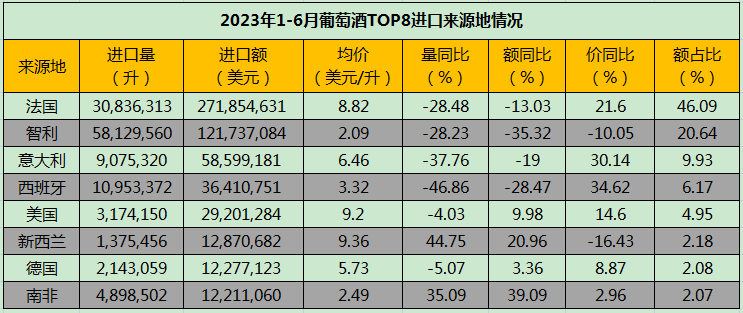 根据中国食品土畜进出口商会酒类进出口商分会数据显示,我国进口葡萄酒均价出现大面积上涨,前九名中(进口额占比超过1%),只有智利和新西兰出现下滑,其他七个国家均大幅上涨,法国酒进口均价上涨21.60%,意大利和西班牙涨幅超过30%,阿根廷酒在这半年内上涨183.02%。