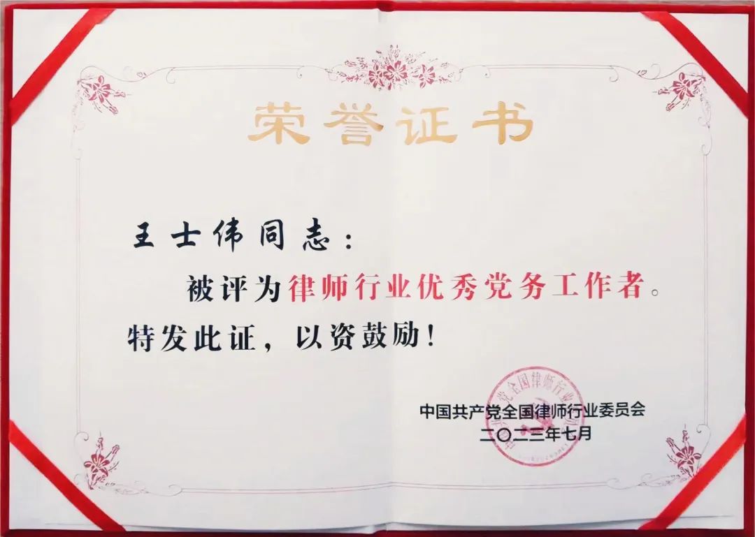 2023年7月,中国共产党全国律师行业委员会作出《关于表彰律师行业党建工作先进典型的决定》,对全国97个律师行业先进基层党组织、100名律师行业优秀共产党员、60名律师行业优秀党务工作者进行表彰。我所王士伟律师荣获“律师行业优秀党务工作者”称号。